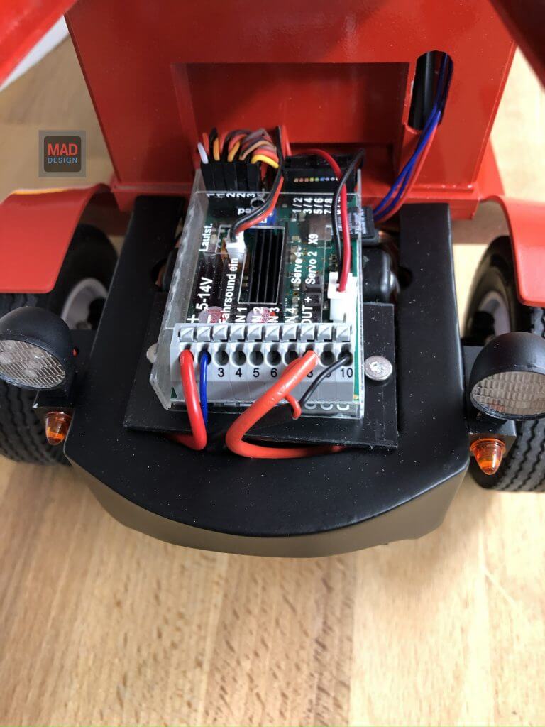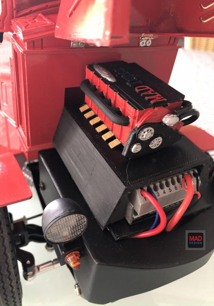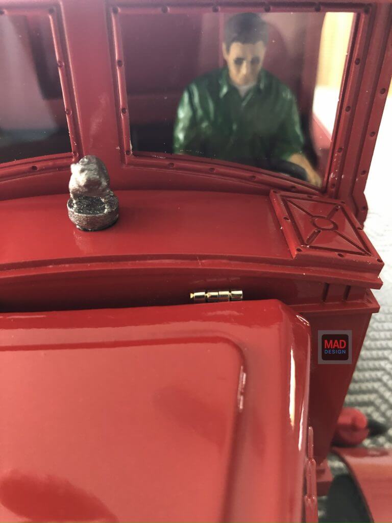 Lackiert in kräftigem Texaco-Rot mit klaren Linien und Beschriftungen wirkt der Bulldog wie frisch aus dem Jahr 1926. 3D gedruckter Motor deckt das Soundmodul schön ab. Beleuchtung, Sound und Elektronik sind integriert – das Modell ist fahrbereit und voll funktionsfähig.